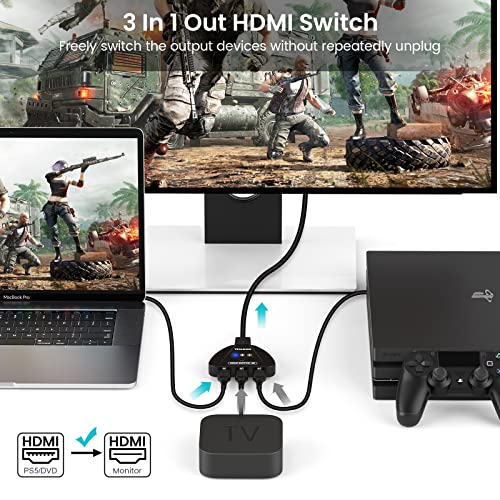 ✦ Brede Compatibiliteit: de HDMI 3 in 1 out-connector is compatibel met de meeste standaard HDMI-apparaten. Ingang: Xbox 360, Xbox One, PS5/PS4/PS3, Chromecast, Fire Stick, Blu-Ray, Blu-Ray dvd-speler, Route Roku, kabelbox, Apple TV, pc, enz. Uitgang: HD Ready, Full HD, UHD-tv’s, monitoren, projectoren en meer.