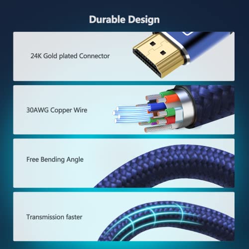 【Stabiele signaaloverdracht】 Zuiver koperen geleider, 24-karaats vergulde connectoren en viervoudige afscherming zorgen voor een optimale overdracht zonder interferentie. Het beeld is helder en soepel zonder vertraging, geen tearing, geen flikkering van het scherm, voor een soepele ervaring.