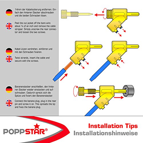 Leveringsinhoud: 8x Poppstar banaanstekkers (hoekig met isolatie en vergrendeling) incl. schroeven, 24k verguld (4x rood, 4x zwart)