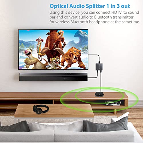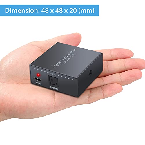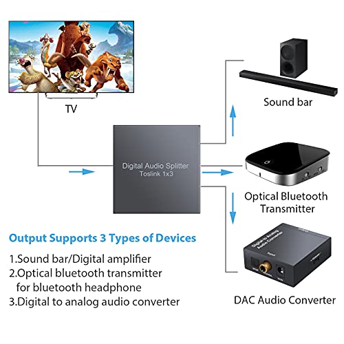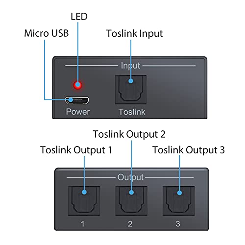 Specification: CAMWAY Digitale audio splitter, 1 in 3 out optische splitter verdeler, 3-voudige schakelaar voor optische SPDIF Toslink audiokabel, met 4 stuks 6,5 ft optische kabel, ondersteuning LPCM 2.0 DTS Dolby AC3