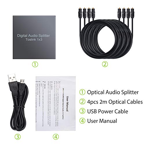 ❤ Verpakkingsinhoud: 1 x Toslink splitter, 1 x USB-datakabel, 4 x 2 m Toslink-kabel (optische kabel), 1 x handleiding (mogelijk niet beschikbaar in het Nederlands).