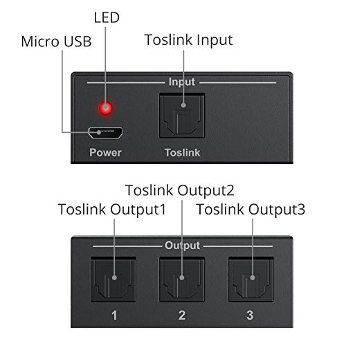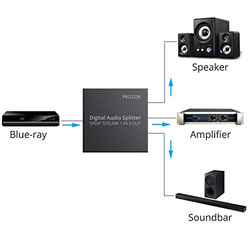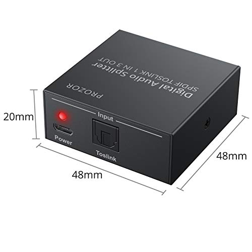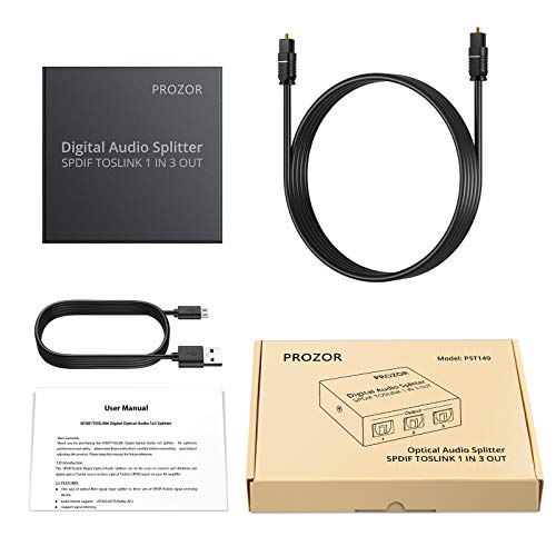 Specification: PROZOR Digitale Audio Splitter 5.1CH 1 x 3 SPDIF Toslink Splitter Ondersteuning LPCM 2.0/DTS met Toslink Kabel voor STB VHS VCR Blue-Ray DVD Spelers HDTV Versterker
