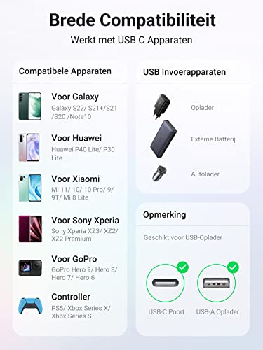 Brede Compatibiliteit: UGREEN USB C kabel is compatibel met Xbox Series X S/ PS5 controller, Galaxy S22/ S21/ S10/ S9/ S8/ A20e/ A51, Huawei P40 Lite/ P30 Lite/ P20 Lite/ Mate 20 Lite/ Honor 9, Redmi Note 10/ 9, enz.